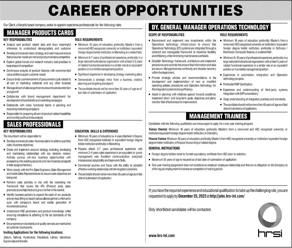 - Human Resource Solution International HRSI Karachi, karachi Sindh Pakistan invites applications from eligible candidates for the post of management trainee, sales professional, deputy general manager operations technology and manager products cards as per advertisement of December 11, 2022 published in daily Jang Newspaper. Bachelor and Master etc.