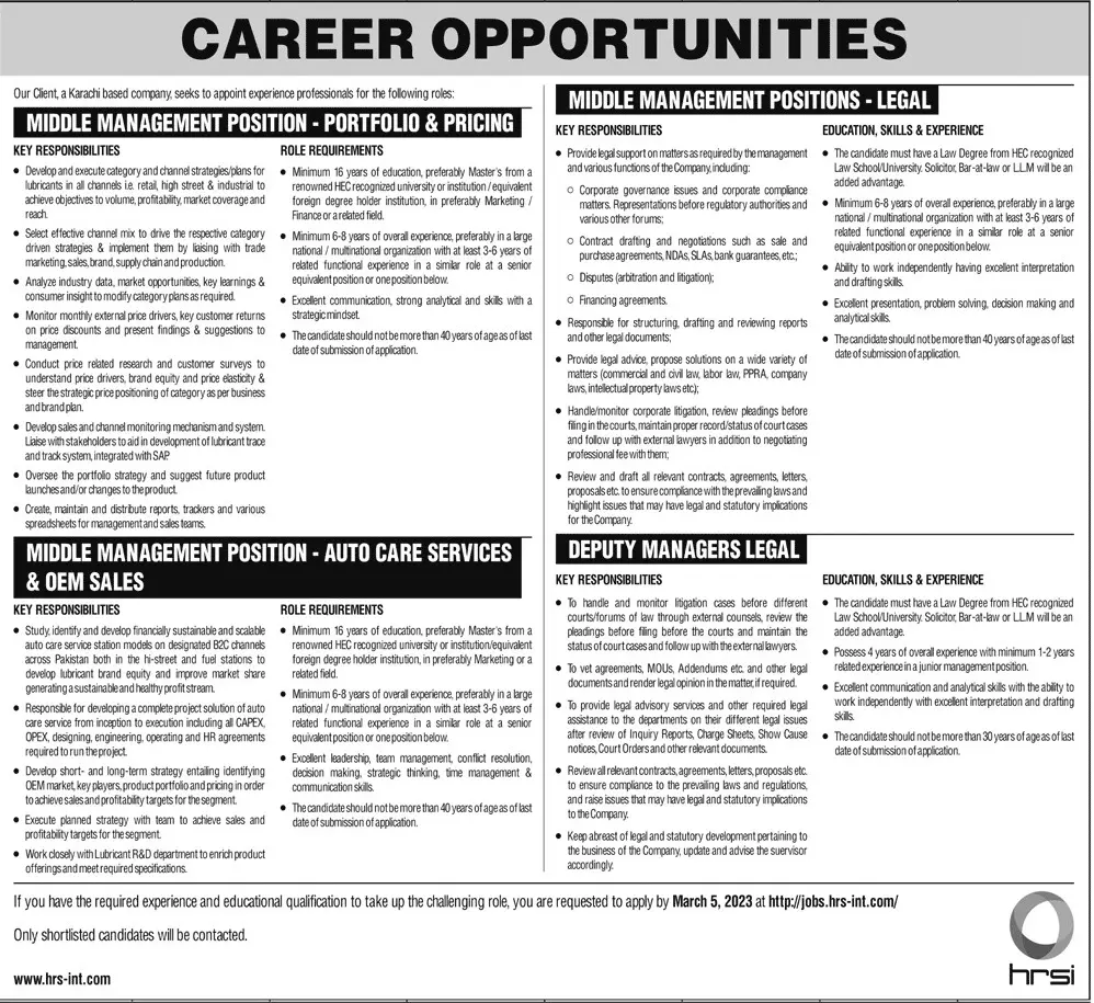 - Karachi Based Company Offers Vacancies for the Positions of Management Positions, Deputy Managers Legal. These posts are to be based Punjab Lahore.