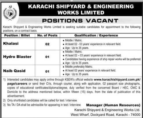 1) Interested candidates may apply online through KSEW's official website www.karachishipyard.com.pk/page/careers or send their CVs, through courier, along with application, 02 passport size photographs, copies of educational certificates/diploma/degree, duly verified from the concerned Board/HEC, CNIC & Domicile to the address mentioned below, within fifteen (15) days, from the date of publication of this advertisement.
