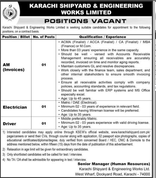 Karachi Shipyard & Engineering Works Limited Jobs 2026 announce the Contract career opportunities for the post of See Below Ad in Sindh, Karachi for the fresh and experienced candidates on Contract basis who have Check Advertisement degree. Posted date of this post is 08/02/2026 and the last date is 23/02/2026. if you are eligible for this job apply before due date.