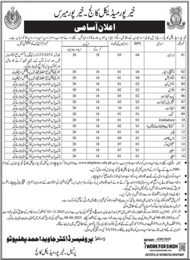 Khairpur Medical College Khairpur Sindh Jobs 2025 announce the Contract career opportunities for the post of See Below Ad in Sindh, Khairpur for the fresh and experienced candidates on Contract basis who have Check Advertisement degree. Posted date of this post is 13/12/2025 and the last date is 28/12/2025. if you are eligible for this job apply before due date.