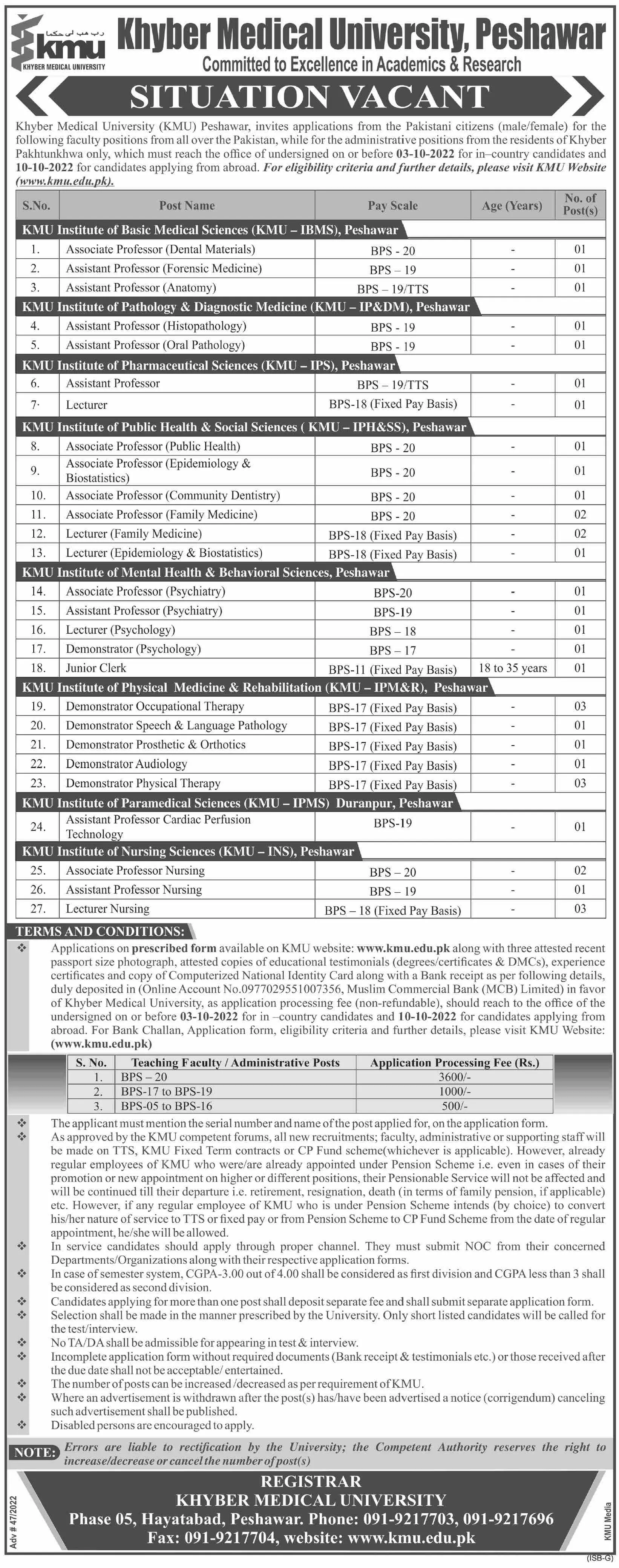Khyber Medical University KMU Jobs 2022 announce the Contract career opportunities for the post of See Below Ad in Khyber Pakhtunkhwa, Peshawar for the fresh and experienced candidates on Contract basis who have Check Advertisement degree. Posted date of this post is 11/09/2022 and the last date is 30/09/2022. if you are eligible for this job apply before due date.
