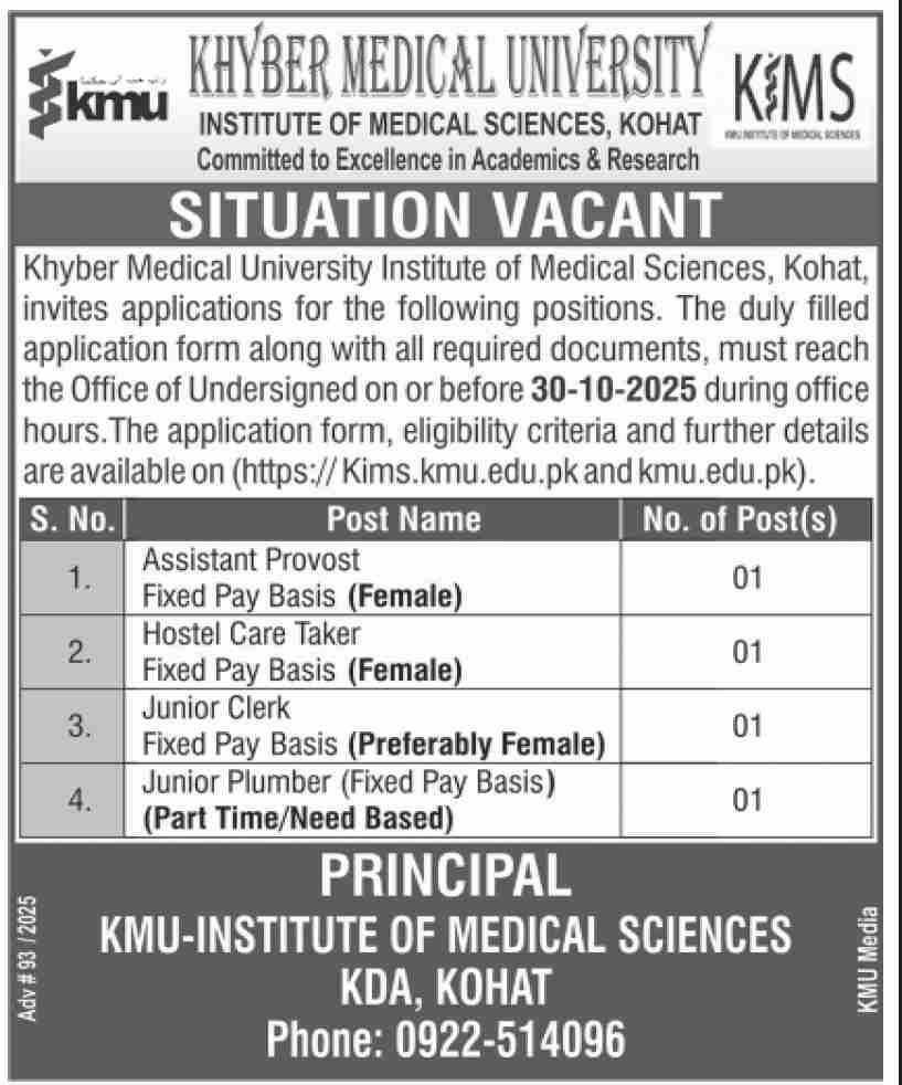 Khyber Medical University KMU Kohat Jobs 2025 announce the Contract career opportunities for the post of See Below Ad in Khyber Pakhtunkhwa, Kohat for the fresh and experienced candidates on Contract basis who have Check Advertisement degree. Posted date of this post is 10/10/2025 and the last date is 30/10/2025. if you are eligible for this job apply before due date.