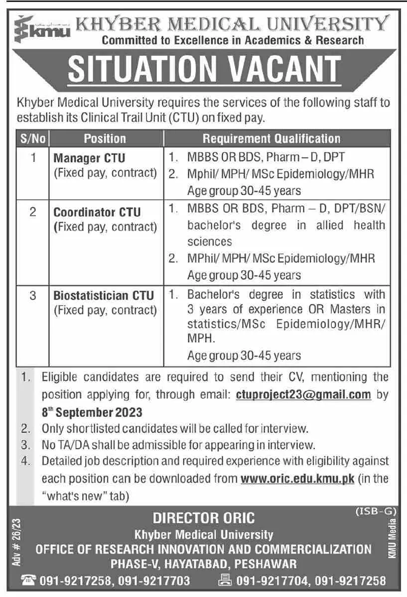 - Detailed job description and required experience with eligibility against each position can be downloaded from www.oric.edu.kmu.pk (in the "what's new" tab)