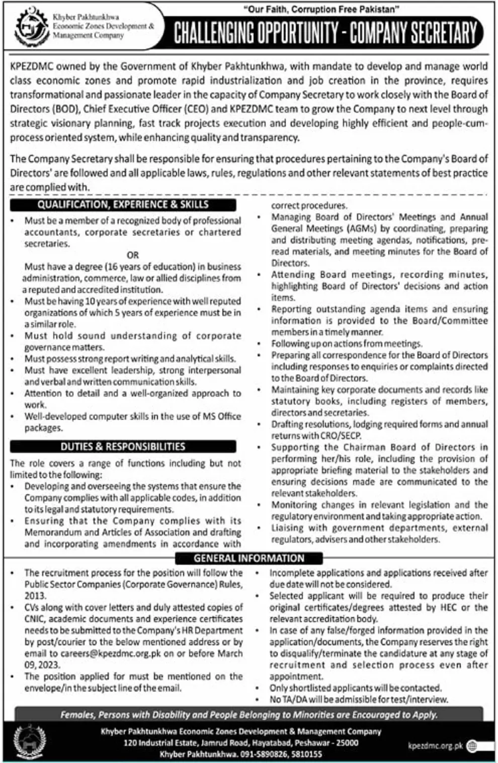 Khyber Pakhtunkhwa Economic Zones Development Jobs 2023 announce the Contract career opportunities for the post of See Below Ad in Khyber Pakhtunkhwa, Peshawar for the fresh and experienced candidates on Contract basis who have Check Advertisement degree. Posted date of this post is 24/02/2023 and the last date is 09/03/2023. if you are eligible for this job apply before due date.