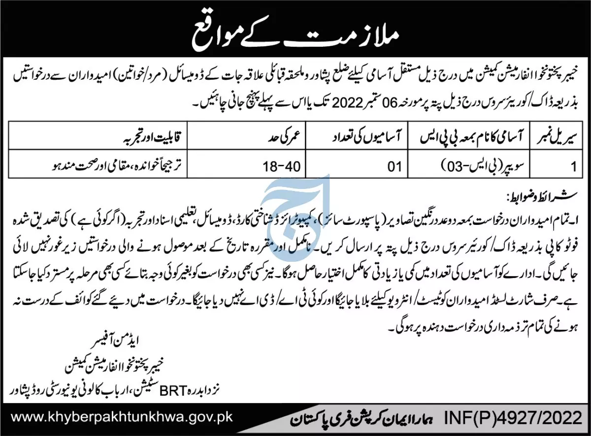 Khyber Pakhtunkhwa Information Commission Jobs 2022 announce the Permanent career opportunities for the post of See Below Ad in Khyber Pakhtunkhwa, Peshawar for the fresh and experienced candidates on Permanent basis who have Check Advertisement degree. Posted date of this post is 24/08/2022 and the last date is 06/09/2022. if you are eligible for this job apply before due date.