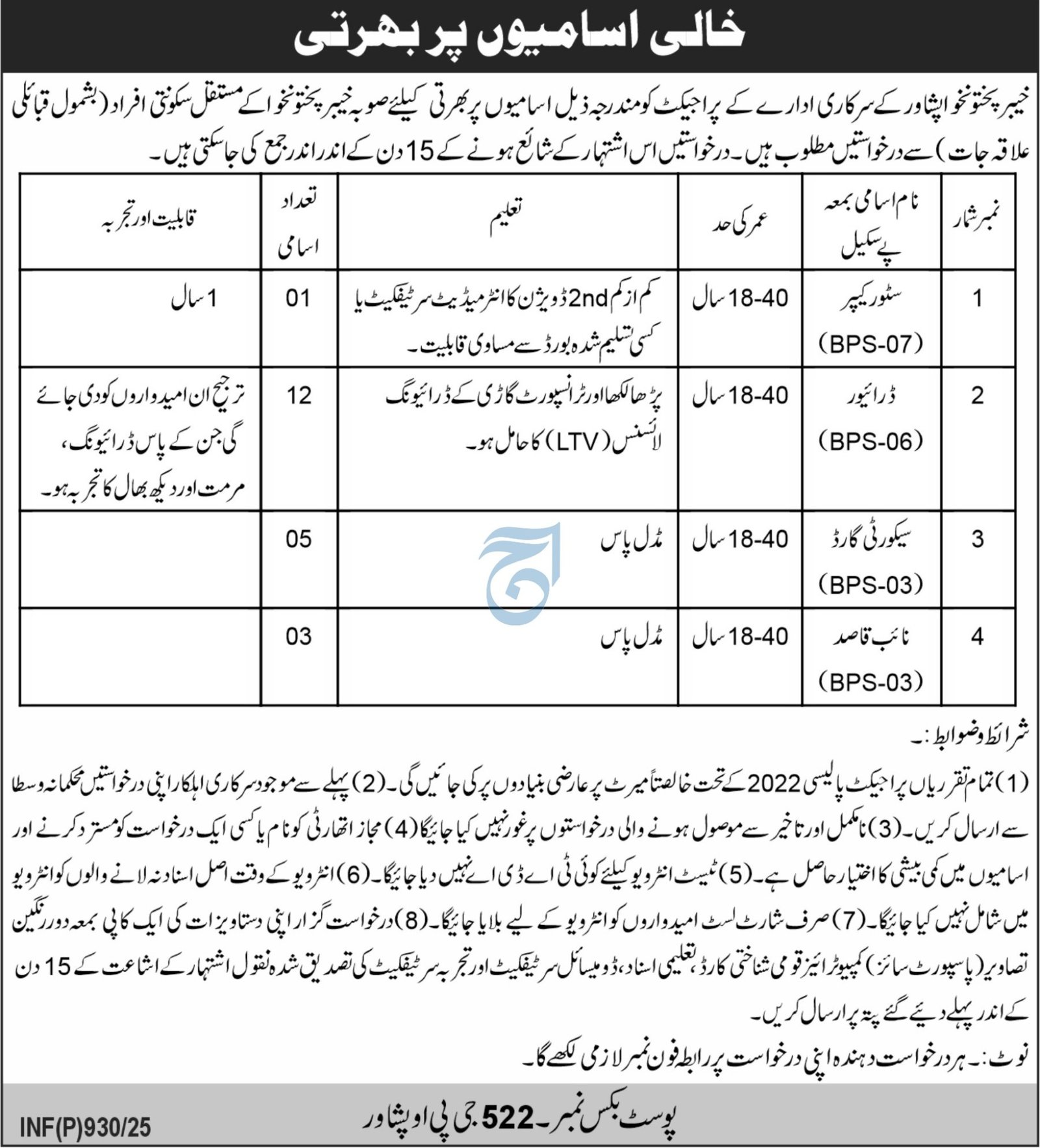 Khyber Pakhtunkhwa Peshawar Government Project Jobs 2025 announce the Contract career opportunities for the post of See Below Ad in Khyber Pakhtunkhwa, Peshawar for the fresh and experienced candidates on Contract basis who have Check Advertisement degree. Posted date of this post is 06/03/2025 and the last date is 21/03/2025. if you are eligible for this job apply before due date.