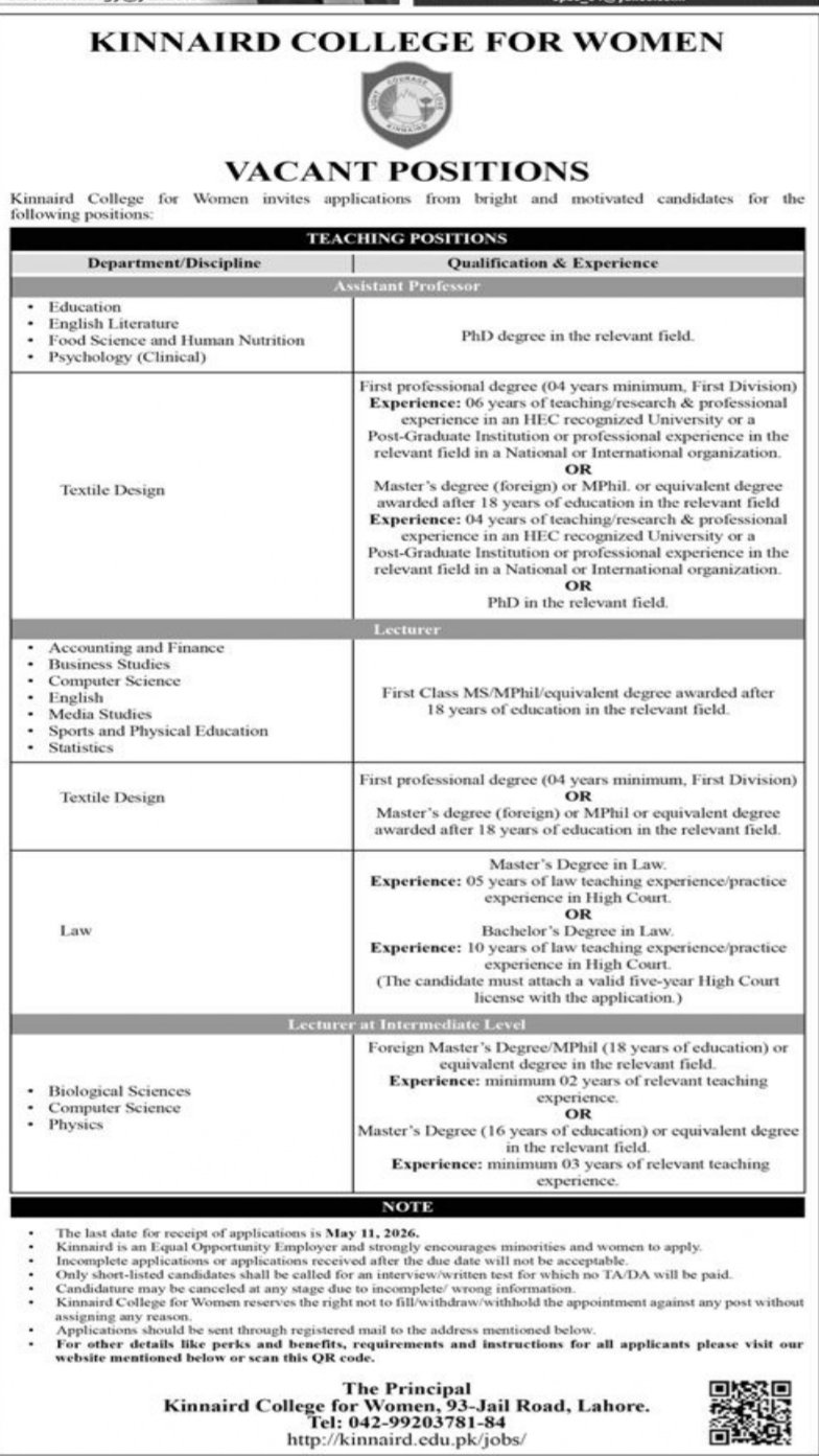 Kinnerd College For Women Lahore Jobs 2026 announce the Contract career opportunities for the post of See Below Ad in Punjab, Lahore for the fresh and experienced candidates on Contract basis who have Check Advertisement degree. Posted date of this post is 26/04/2026 and the last date is 11/05/2026. if you are eligible for this job apply before due date.