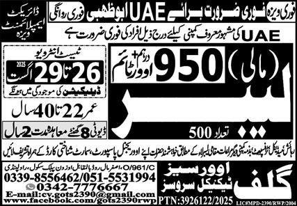 Labor & Mali Jobs 2025 In UAE announce the Contract career opportunities for the post of See Below Ad in United Arab Emirates for the fresh and experienced candidates on Contract basis who have Check Advertisement degree. Posted date of this post is 23/08/2025 and the last date is 29/08/2025. if you are eligible for this job apply before due date.