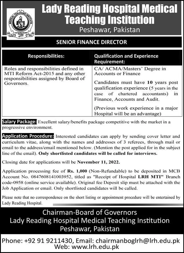 - Application processing fee of Rs. 1000/- (non-refundable) to be deposited in MCB Account No.0847608141003952 (online), titled as “Receipt of Hospital LRH MTI” Branch Code (0958).
