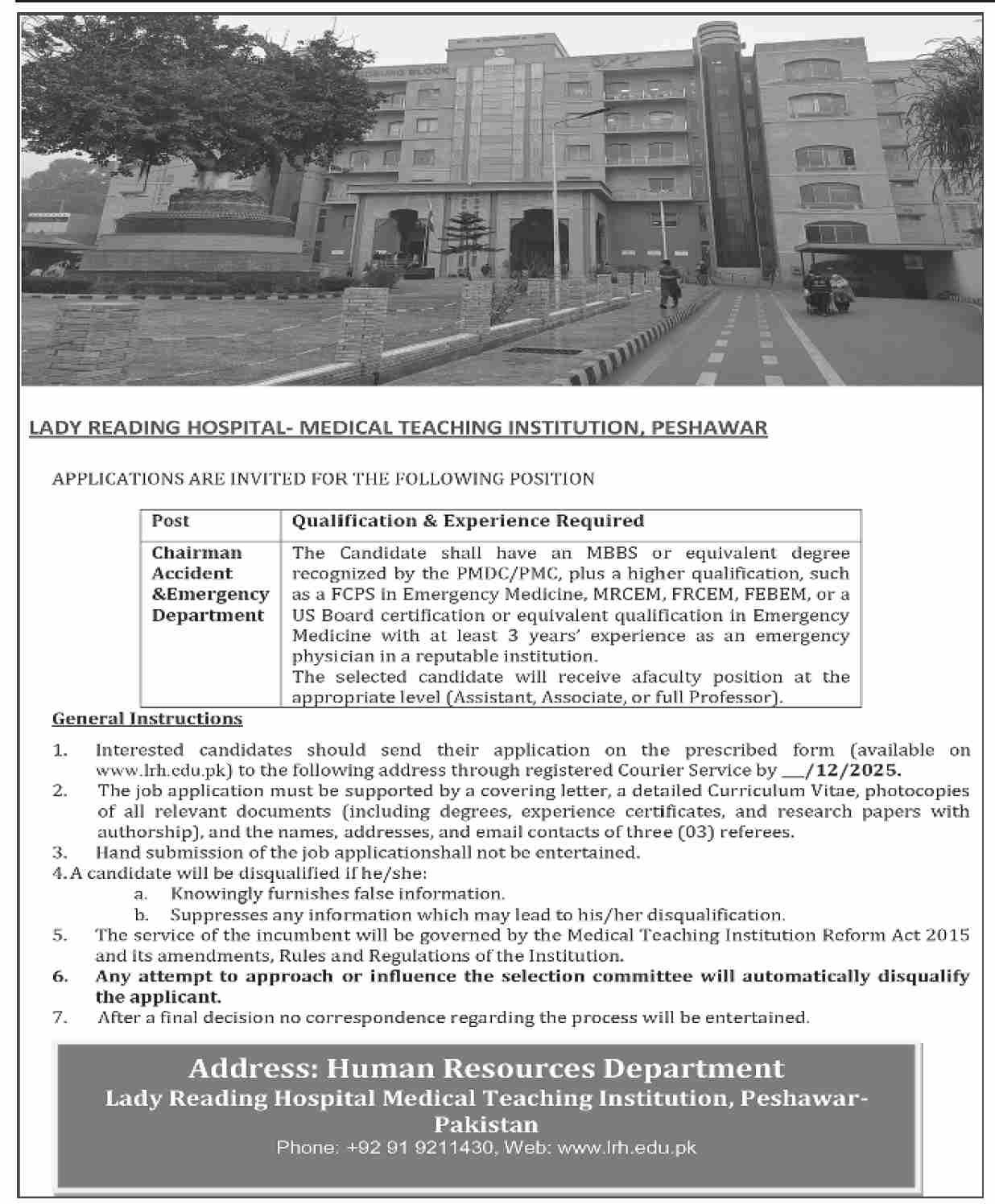Lady Reading Hospital Peshawar Jobs 2025 announce the Contract career opportunities for the post of See Below Ad in Khyber Pakhtunkhwa, Peshawar for the fresh and experienced candidates on Contract basis who have Check Advertisement degree. Posted date of this post is 04/12/2025 and the last date is 19/12/2025. if you are eligible for this job apply before due date.
