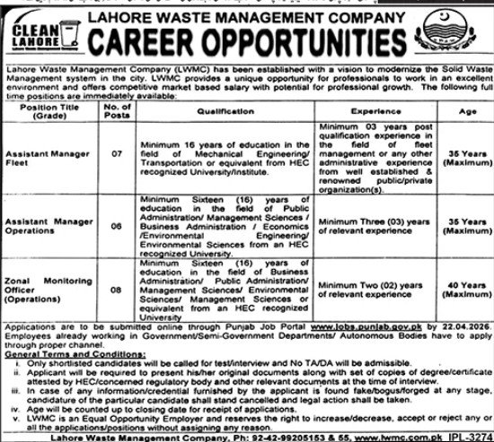 Lahore Waste Management Company (LWMC Jobs 2026 announce the Contract career opportunities for the post of See Below Ad in Punjab, Lahore for the fresh and experienced candidates on Contract basis who have Check Advertisement degree. Posted date of this post is 04/04/2026 and the last date is 22/04/2026. if you are eligible for this job apply before due date.