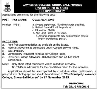 Lawrence College Ghora Gali Murree Jobs 2025 announce the Contract career opportunities for the post of See Below Ad in Punjab, Murree for the fresh and experienced candidates on Contract basis who have Check Advertisement degree. Posted date of this post is 02/11/2025 and the last date is 17/11/2025. if you are eligible for this job apply before due date.