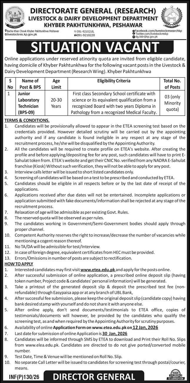 Livestock & Dairy Development Department Peshawar Jobs 2026 announce the Contract career opportunities for the post of See Below Ad in Khyber Pakhtunkhwa, Peshawar for the fresh and experienced candidates on Contract basis who have Check Advertisement degree. Posted date of this post is 09/01/2026 and the last date is 30/01/2026. if you are eligible for this job apply before due date.