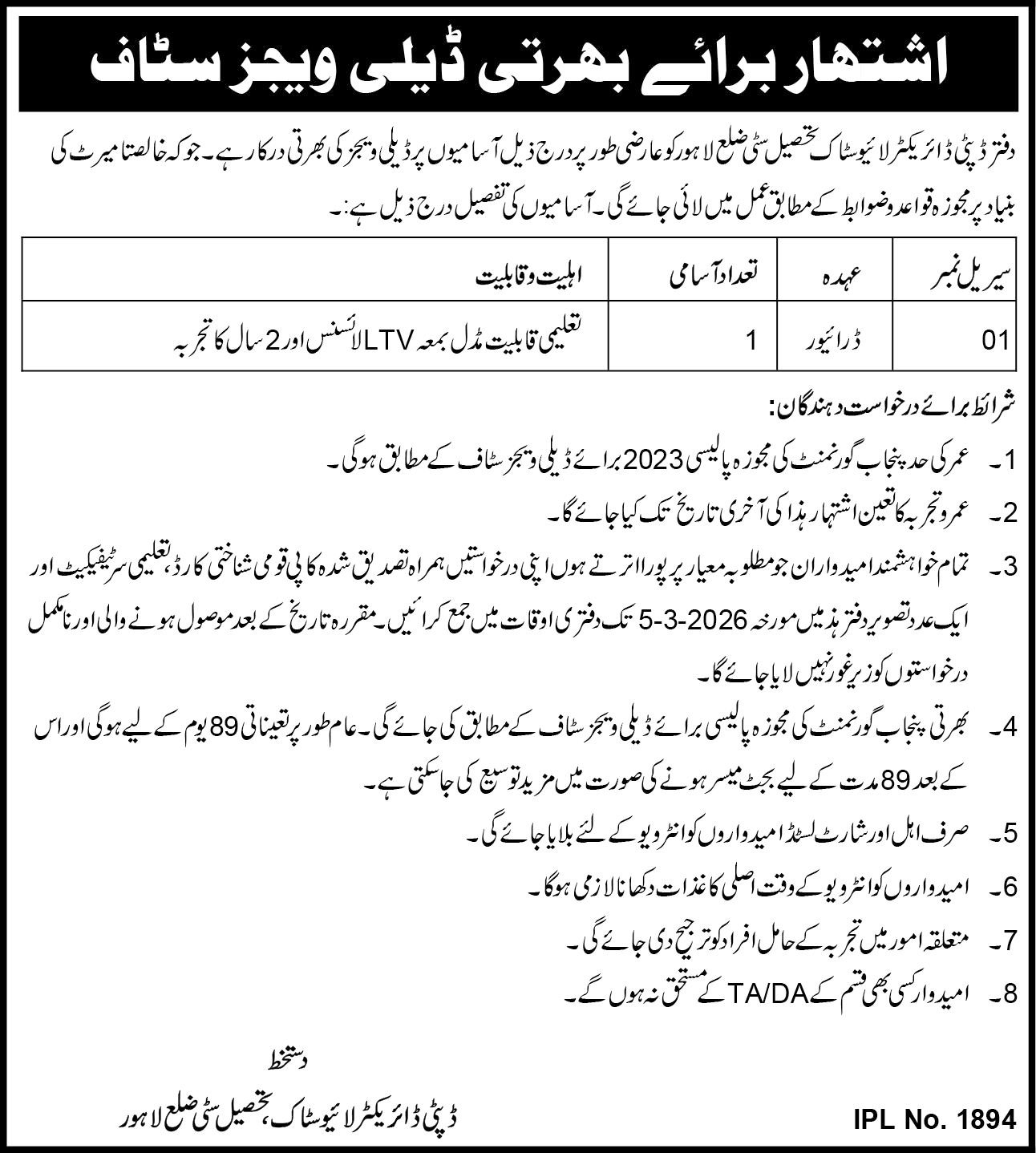 The office of the Deputy Director Livestock, Tehsil City, District Lahore, temporarily requires recruitment on daily wages for the following posts, which will be carried out strictly on merit basis according to the proposed rules and regulations. The details of the posts are as follows: