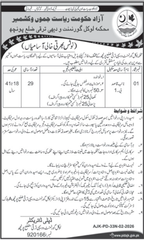 Local Government And Rural Development Department Job 2026 announce the Contract career opportunities for the post of See Below Ad in Azad Jammu Kashmir, Poonch for the fresh and experienced candidates on Contract basis who have Check Advertisement degree. Posted date of this post is 04/02/2026 and the last date is 18/02/2026. if you are eligible for this job apply before due date.
