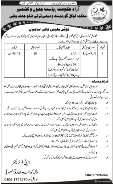 Local Government & Rural Development Department Job announce the Contract career opportunities for the post of See Below Ad in Azad Jammu Kashmir, Muzaffarabad for the fresh and experienced candidates on Contract basis who have Check Advertisement degree. Posted date of this post is 27/01/2026 and the last date is 11/02/2026. if you are eligible for this job apply before due date.