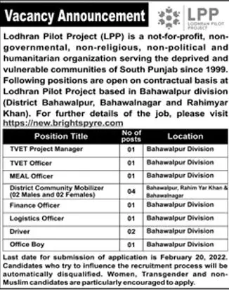 Lodhran Pilot Project (LPP) JOBS announce the Contract career opportunities for the post of See Below Ad in Bahawalpur for the fresh and experienced candidates on Contract basis who have Check Advertisement degree. Posted date of this post is 16/02/2022 and the last date is 20/02/2022. if you are eligible for this job apply before due date.