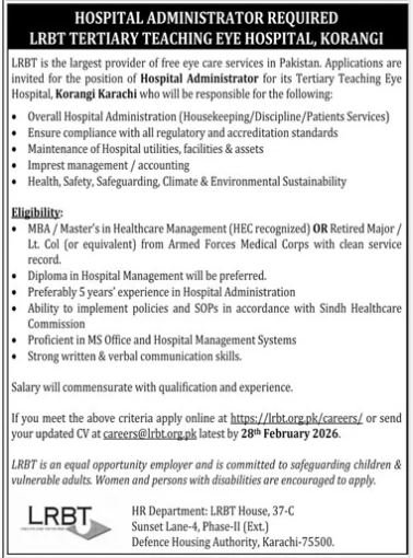 HOSPITAL ADMINISTRATOR REQUIRED LRBT TERTIARY TEACHING EYE HOSPITAL, KORANGI