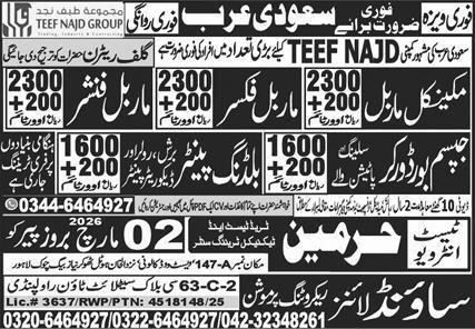 Marble Fixer & Building Painter Jobs 2026 In Saudi Arabia announce the Contract career opportunities for the post of See Below Ad in Saudi Arabia for the fresh and experienced candidates on Contract basis who have Check Advertisement degree. Posted date of this post is 21/02/2026 and the last date is 02/03/2026. if you are eligible for this job apply before due date.
