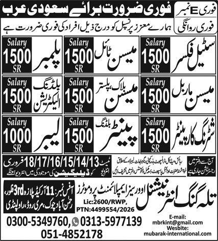 Marble Mason & Steel Fixer Jobs 2026 In Saudi Arabia announce the Contract career opportunities for the post of See Below Ad in Saudi Arabia for the fresh and experienced candidates on Contract basis who have Check Advertisement degree. Posted date of this post is 12/02/2026 and the last date is 18/02/2026. if you are eligible for this job apply before due date.