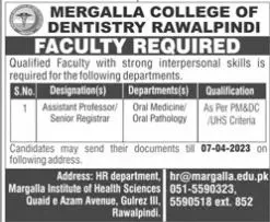 Margalla College of Dentistry Rawalpindi Jobs 2023 announce the Contract career opportunities for the post of See Below Ad in Punjab, Rawalpindi for the fresh and experienced candidates on Contract basis who have Check Advertisement degree. Posted date of this post is 31/03/2023 and the last date is 07/04/2023. if you are eligible for this job apply before due date.