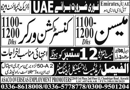 Mason And Construction Worker Jobs in UAE 2025 announce the Contract career opportunities for the post of See Below Ad in United Arab Emirates for the fresh and experienced candidates on Contract basis who have Check Advertisement degree. Posted date of this post is 09/09/2025 and the last date is 12/09/2025. if you are eligible for this job apply before due date.
