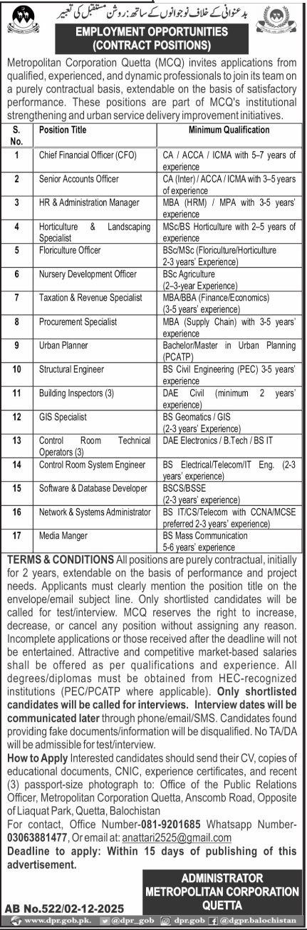 MCQ Metropolitan Corporation Quetta Jobs 2025 announce the Contract career opportunities for the post of See Below Ad in Balochistan, Quetta for the fresh and experienced candidates on Contract basis who have Check Advertisement degree. Posted date of this post is 03/12/2025 and the last date is 17/12/2025. if you are eligible for this job apply before due date.