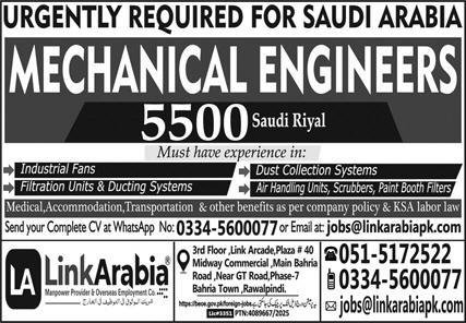 Mechanical Engineers Jobs in Saudia Arabia 2025 announce the Contract career opportunities for the post of See Below Ad in Saudi Arabia for the fresh and experienced candidates on Contract basis who have Check Advertisement degree. Posted date of this post is 07/10/2025 and the last date is 08/10/2025. if you are eligible for this job apply before due date.