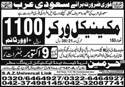 Mechanical Worker Jobs in Saudia Arabia 2025 announce the Contract career opportunities for the post of See Below Ad in Saudi Arabia for the fresh and experienced candidates on Contract basis who have Check Advertisement degree. Posted date of this post is 06/10/2025 and the last date is 09/10/2025. if you are eligible for this job apply before due date.