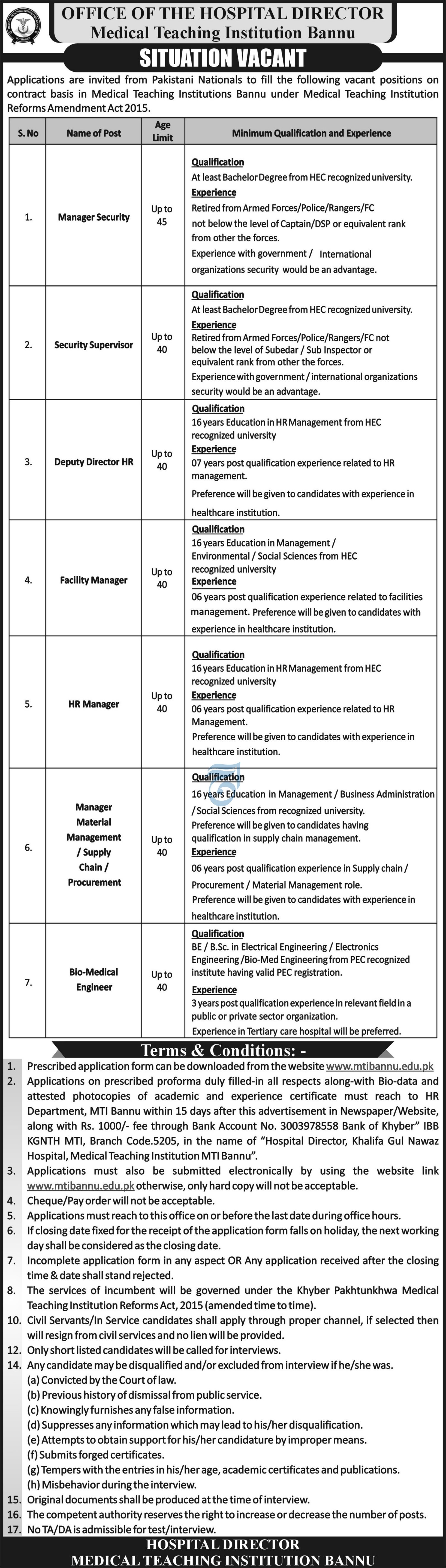 Medical Teaching Institution Bannu Jobs 2025 announce the Contract career opportunities for the post of See Below Ad in Khyber Pakhtunkhwa, Bannu for the fresh and experienced candidates on Contract basis who have Check Advertisement degree. Posted date of this post is 21/11/2025 and the last date is 06/12/2025. if you are eligible for this job apply before due date.