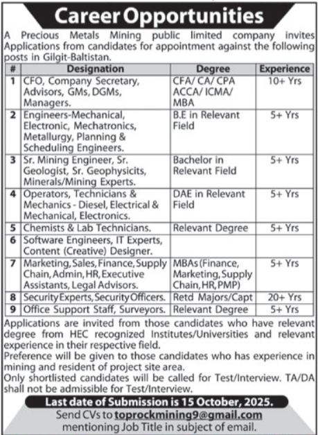 Metals Mining Public Company Gilgit Jobs 2025 announce the Contract career opportunities for the post of See Below Ad in Gilgit Baltistan, Gilgit for the fresh and experienced candidates on Contract basis who have Check Advertisement degree. Posted date of this post is 02/10/2025 and the last date is 15/10/2025. if you are eligible for this job apply before due date.