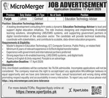 MicroMerger Lahore Punjab Jobs 2026 announce the Contract career opportunities for the post of See Below Ad in Punjab, Lahore for the fresh and experienced candidates on Contract basis who have Check Advertisement degree. Posted date of this post is 05/04/2026 and the last date is 17/04/2026. if you are eligible for this job apply before due date.