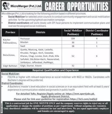 - Micromerger Private Limited is seeking applications to hire staff in Khyber Pakhtunkhwa, Balochistan, and Gilgit Baltistan.