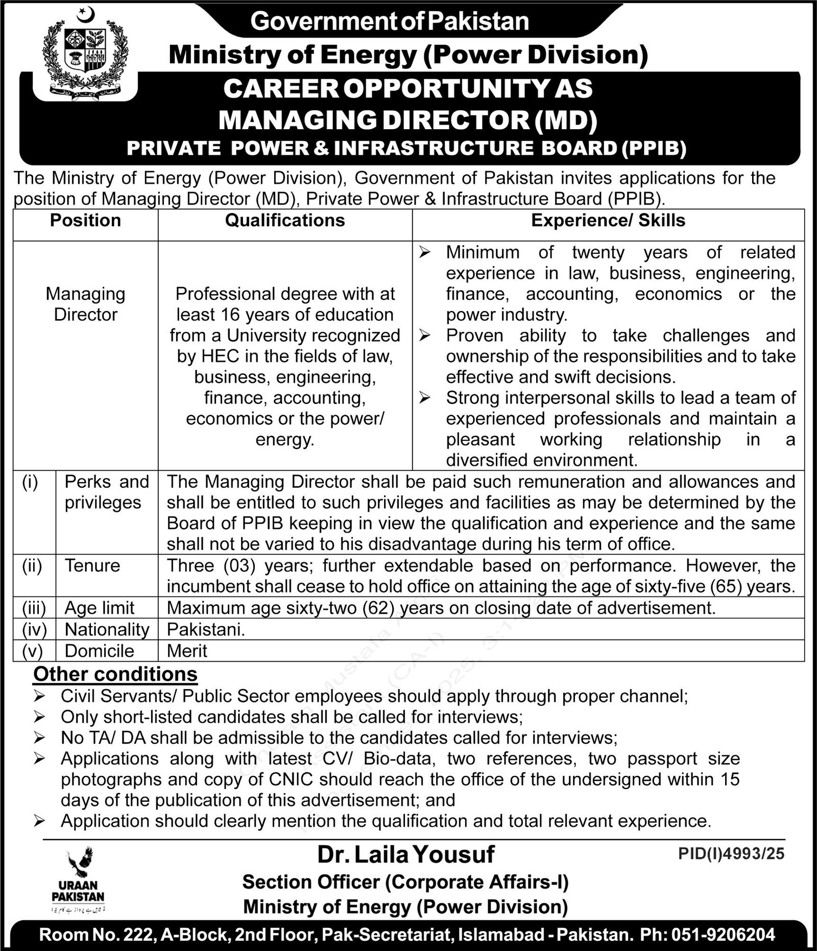 The Ministry of Energy (Power Division), Government of Pakistan invites applications for the position of Managing Director (MD), Private Power & Infrastructure Board (PPIB).