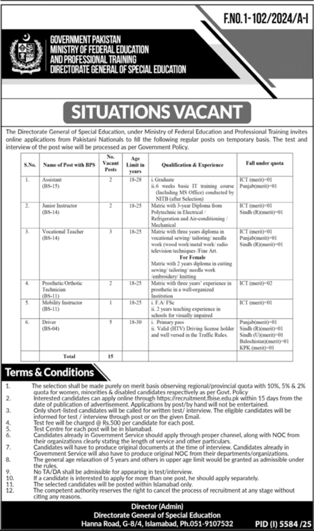 The Directorate General of Special Education, under Ministry of Federal Education and Professional Training invites online applications from Pakistani Nationals to fill the following regular posts on temporary basis. The test and interview of the post wise will be processed as per Government Policy.