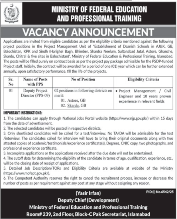 Ministry Of Federal Education & Professional Training Job announce the Contract career opportunities for the post of See Below Ad in Federal, Islamabad for the fresh and experienced candidates on Contract basis who have Check Advertisement degree. Posted date of this post is 12/02/2026 and the last date is 27/02/2026. if you are eligible for this job apply before due date.