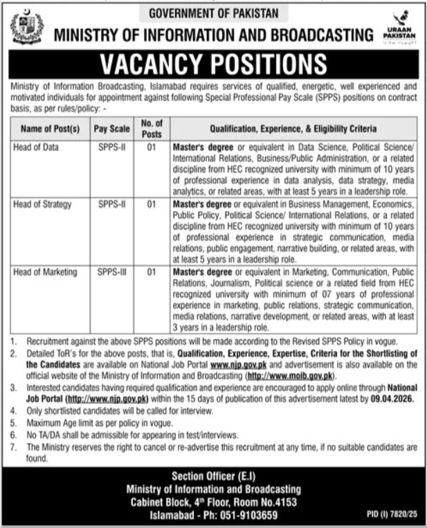 Ministry Of Information And Broadcasting Islamabad Jobs 2026 announce the Contract career opportunities for the post of See Below Ad in Federal, Islamabad for the fresh and experienced candidates on Contract basis who have Check Advertisement degree. Posted date of this post is 26/03/2026 and the last date is 09/04/2026. if you are eligible for this job apply before due date.