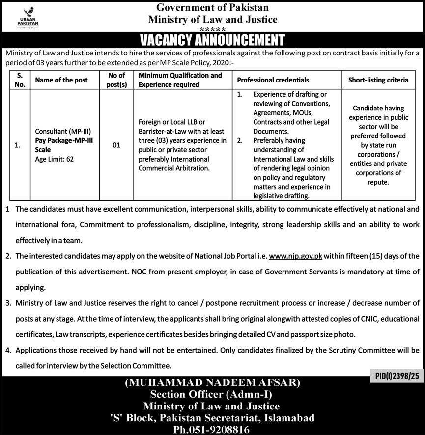 Ministry Of Law And Justice Islamabad Jobs 2025 announce the Contract career opportunities for the post of See Below Ad in Federal, Islamabad for the fresh and experienced candidates on Contract basis who have Check Advertisement degree. Posted date of this post is 21/09/2025 and the last date is 06/10/2025. if you are eligible for this job apply before due date.