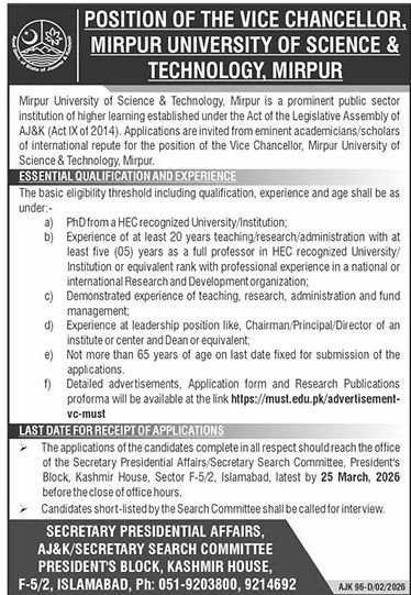 Mirpur University Of Science And Technology Jobs 2026 announce the Contract career opportunities for the post of See Below Ad in Azad Jammu Kashmir, Mirpur for the fresh and experienced candidates on Contract basis who have Check Advertisement degree. Posted date of this post is 23/02/2026 and the last date is 25/03/2026. if you are eligible for this job apply before due date.
