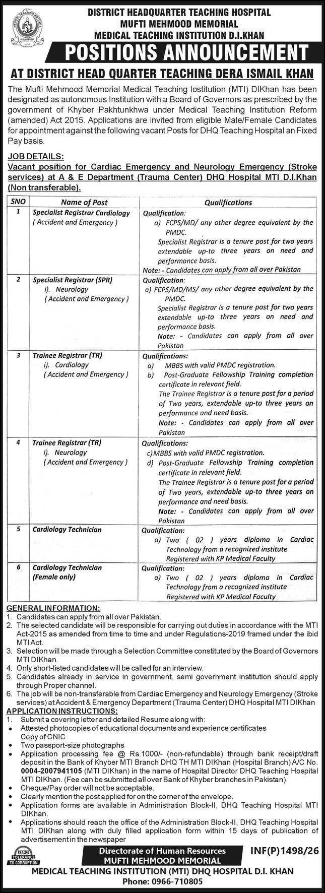 The Mufti Mehmood Memorial Medical Teaching Institution (MTI) D.I.Khan has been designated as autonomous Institution with a Board of Governors as prescribed by the government of Khyber Pakhtunkhwa under Medical Teaching Institution Reform (amended) Act 2015. Applications are invited from eligible Male/Female Candidates for appointment against the following vacant Posts for DHQ Teaching Hospital on Fixed Pay basis.