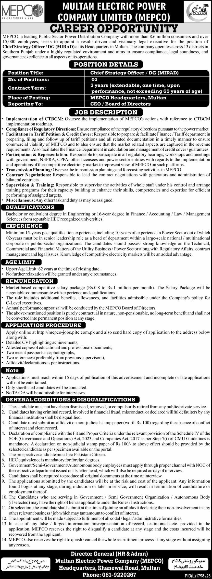 MEPCO, a leading Public Sector Power Distribution Company with more than 8.6 million consumers and over 15,000 employees, seeks to appoint a results-driven and visionary legal executive for the position of Chief Strategy Officer/DG (MIRAD) at its Headquarters in Multan. The company operates across 13 districts in Southern Punjab under a highly regulated environment in all aspects of its operations to ensure compliance, legal soundness, and implementation of CTBCM.