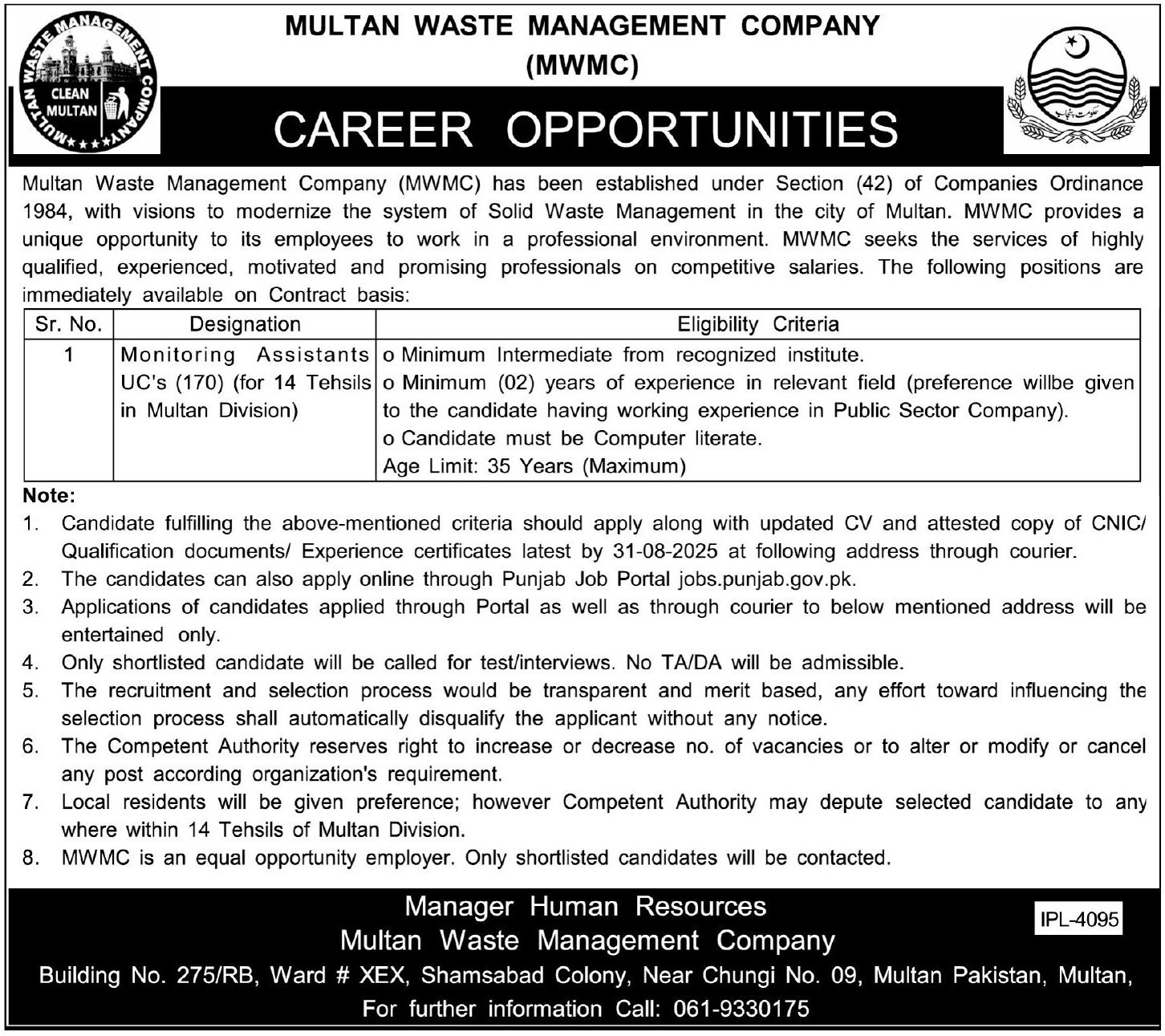 Multan Waste Management Company MWMC Jobs 2025 announce the Contract career opportunities for the post of See Below Ad in Punjab, Multan for the fresh and experienced candidates on Contract basis who have Check Advertisement degree. Posted date of this post is 14/08/2025 and the last date is 31/08/2025. if you are eligible for this job apply before due date.