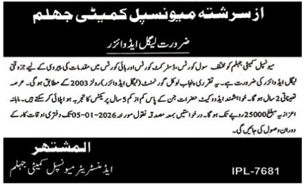 Municipal Committee Jhelum requires a part-time Legal Advisor to pursue cases in various Civil Courts, District Courts, and High Courts. This appointment will be according to the Punjab Local Government (Legal Advisor) Rules 2003. The tenure of appointment will be 2 years. Interested advocates who have at least 5 years of practice experience can apply. The monthly honorarium will be up to PKR 25,000. Applications along with attested copies will be received during office hours until 2026-01-05.