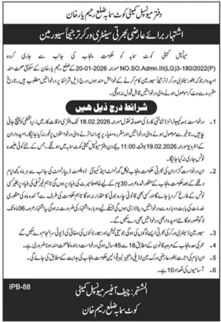 Applications are required from healthy local candidates of District Rahim Yar Khan who are desirous of working as Sanitary Workers, preferably Sewer Men, under the conditions issued by the Government of Punjab vide letter No. SO.Admn.III(LG)3-180/2022(P) dated 20-01-2026. Applications received after the due date will not be acceptable.