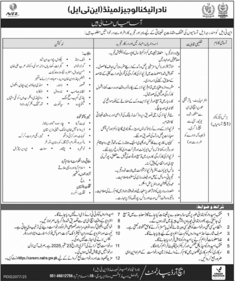 Nadra Technologies Limited NTL Islamabad Job 2025 announce the Contract career opportunities for the post of See Below Ad in Federal, Islamabad for the fresh and experienced candidates on Contract basis who have Check Advertisement degree. Posted date of this post is 10/09/2025 and the last date is 23/09/2025. if you are eligible for this job apply before due date.