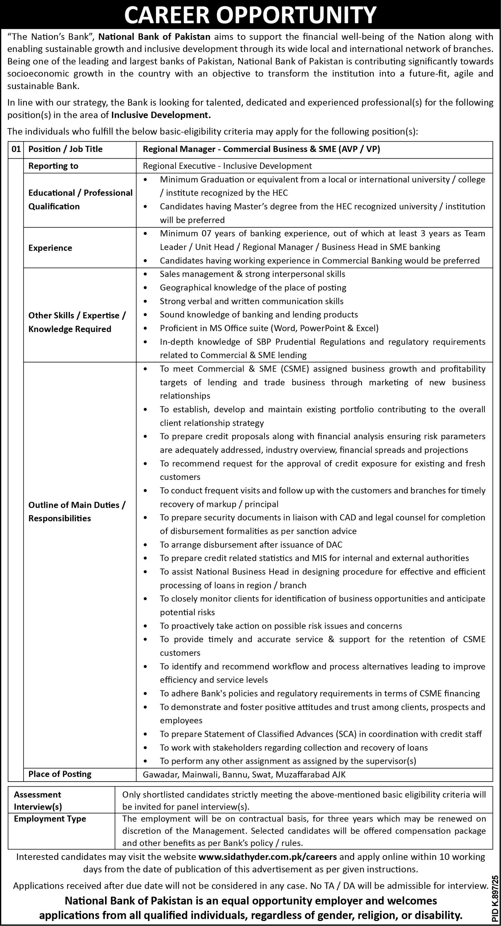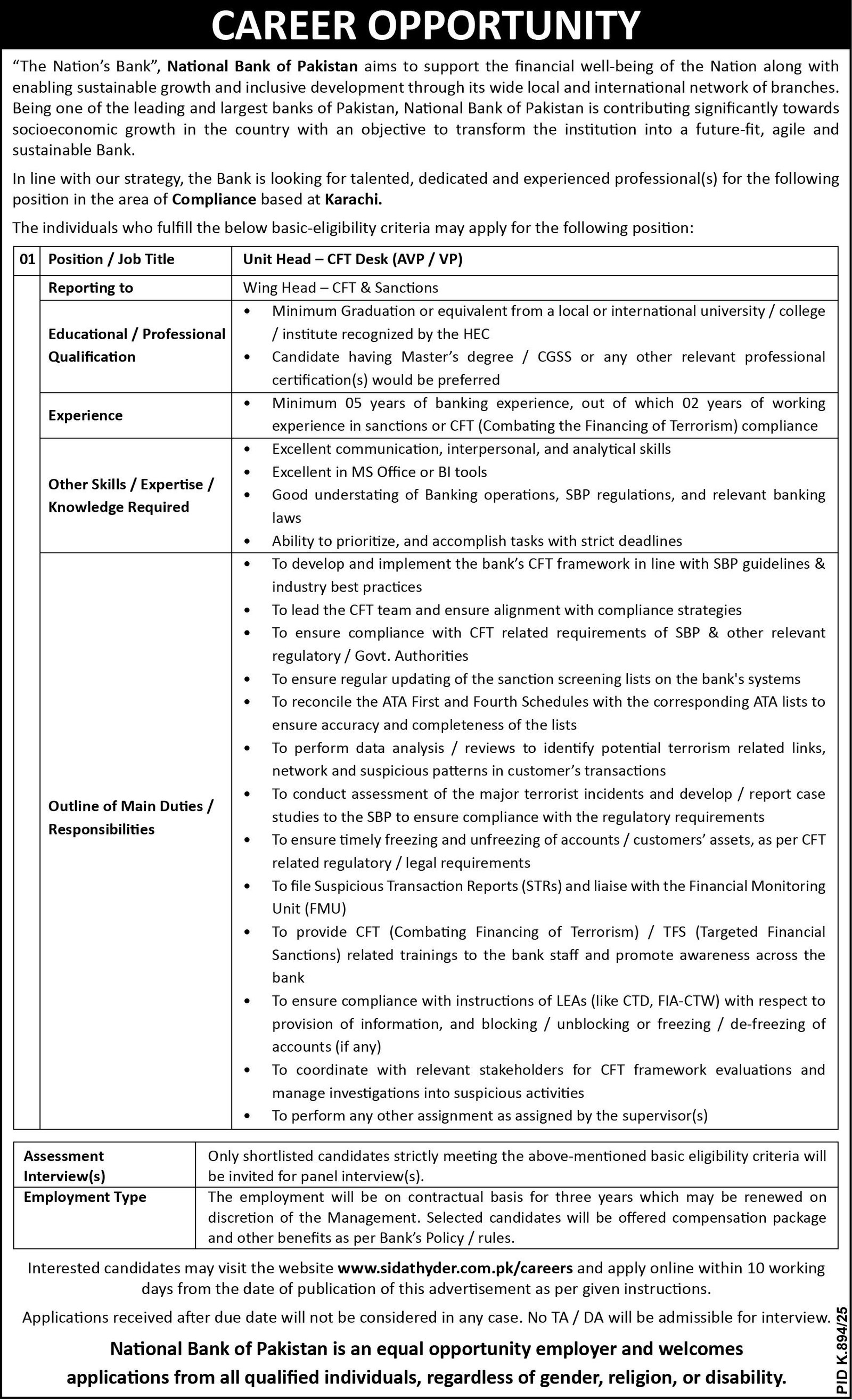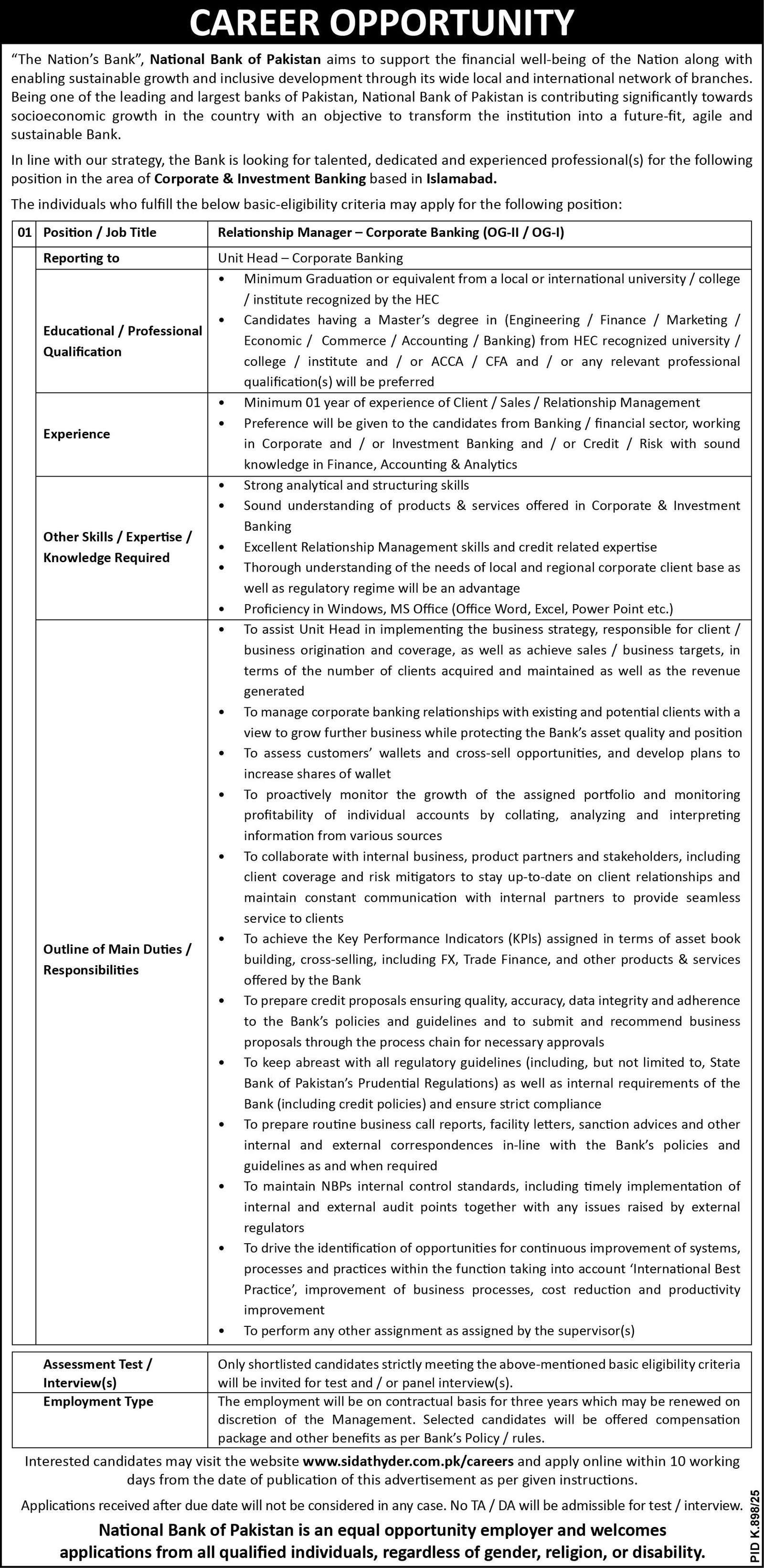 National Bank Of Pakistan NBP Jobs 2025 announce the Contract career opportunities for the post of See Below Ad in Sindh, Karachi for the fresh and experienced candidates on Contract basis who have Check Advertisement degree. Posted date of this post is 14/09/2025 and the last date is 26/09/2025. if you are eligible for this job apply before due date.