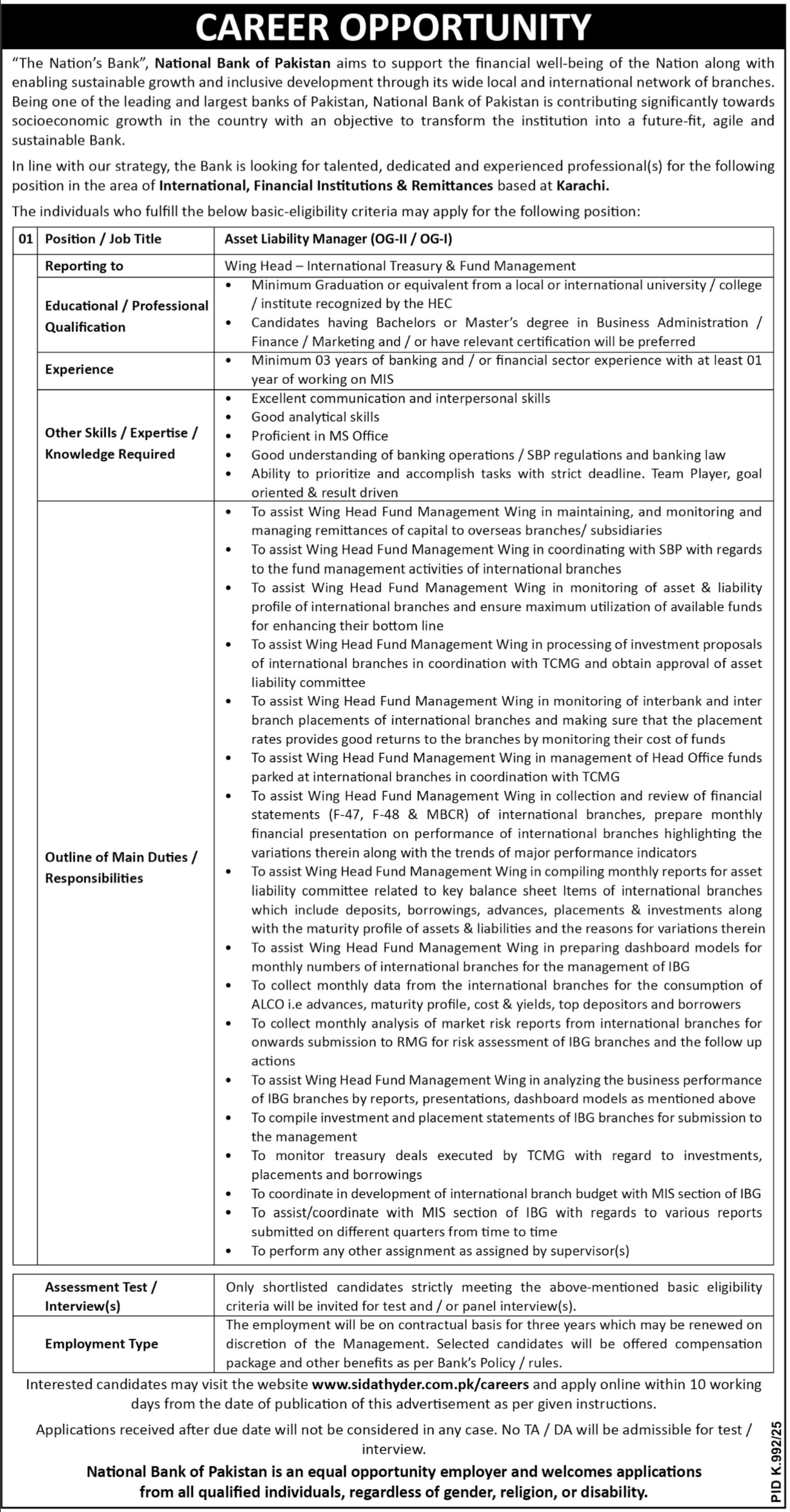 National Bank of Pakistan NBP Karachi Jobs 2025 announce the Contract career opportunities for the post of See Below Ad in Sindh, Karachi for the fresh and experienced candidates on Contract basis who have Check Advertisement degree. Posted date of this post is 21/09/2025 and the last date is 03/10/2025. if you are eligible for this job apply before due date.