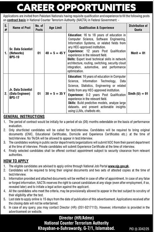 National Counter Terrorism Authority NACTA Islamabad Jobs announce the Contract career opportunities for the post of See Below Ad in Federal, Islamabad for the fresh and experienced candidates on Contract basis who have Check Advertisement degree. Posted date of this post is 24/10/2025 and the last date is 08/11/2025. if you are eligible for this job apply before due date.