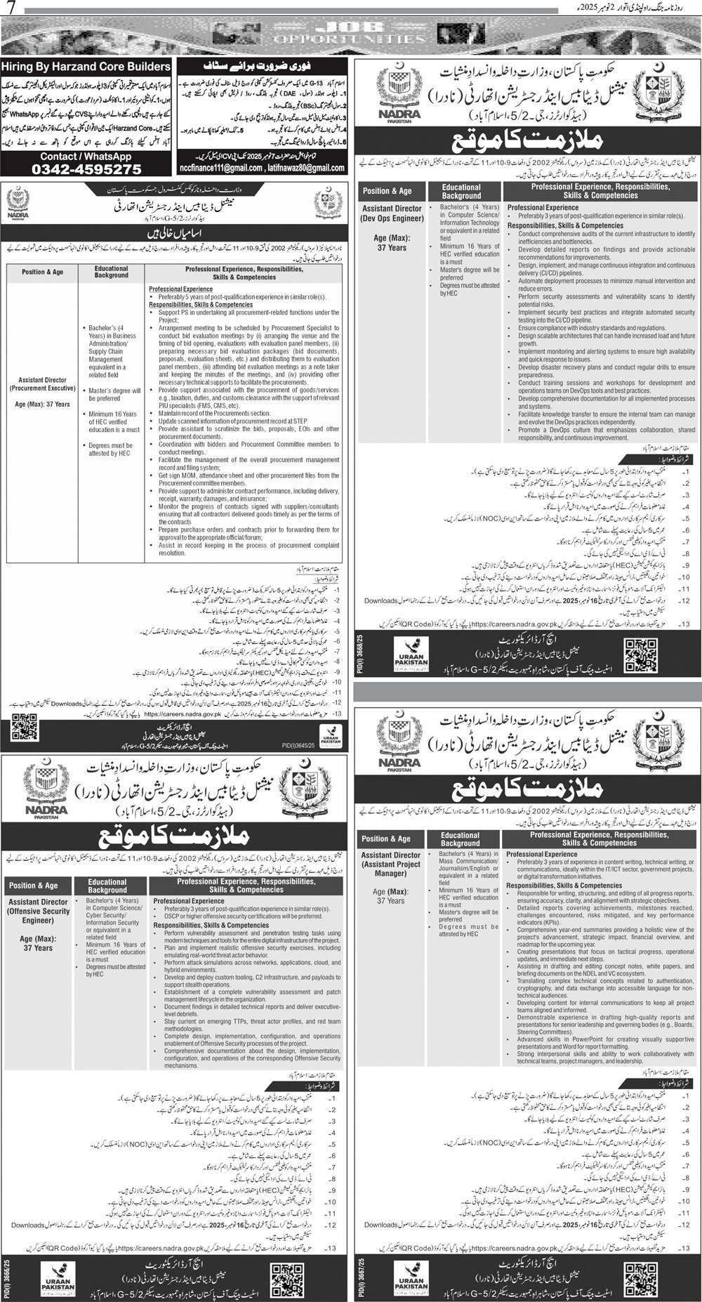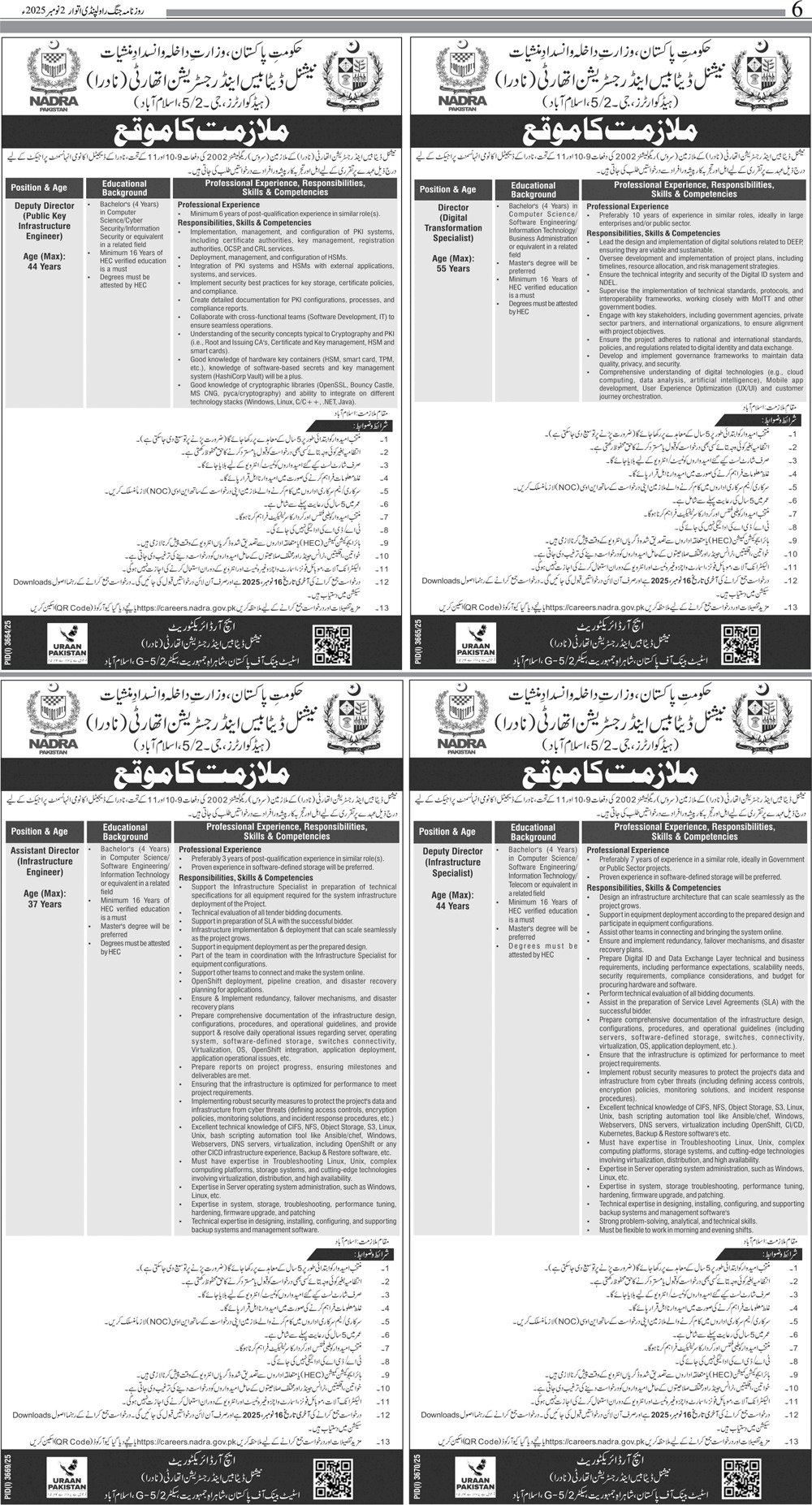 National Database & Registration Authority NADRA Job 2025 announce the Contract career opportunities for the post of See Below Ad in Federal, Islamabad for the fresh and experienced candidates on Contract basis who have Check Advertisement degree. Posted date of this post is 02/11/2025 and the last date is 16/11/2025. if you are eligible for this job apply before due date.